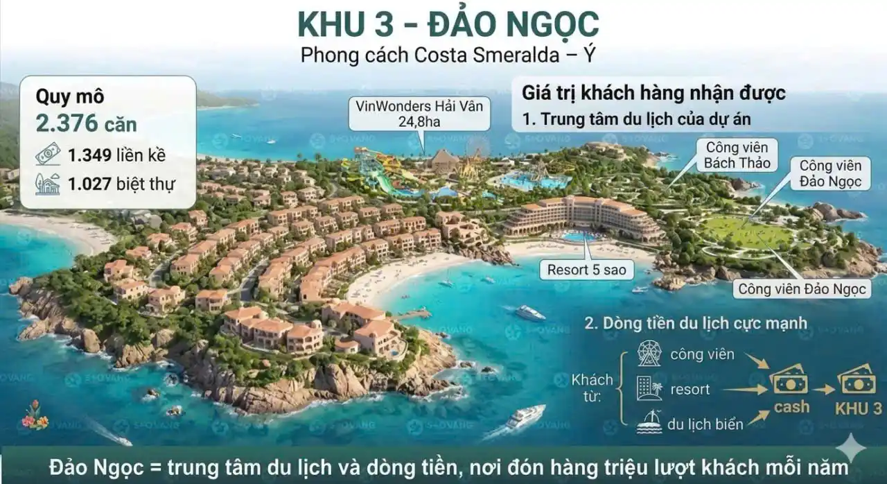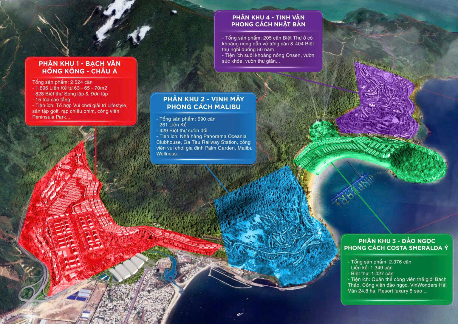 Dựa trên quy mô lớn và địa hình phong phú, Vinhomes Hải Vân Bay được chia thành 4 phân khu chính, mỗi phân khu mang một nhiệm vụ và phong cách riêng, tạo nên không gian sống đa tầng cho cư dân và du khách